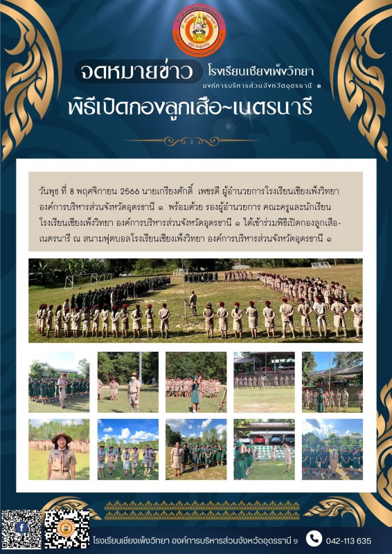 วันพุธ ที่ 8 พฤศจิกายน 2566 นายเกรียงศักดิ์ เพชรดี ผู้อำนวยการโรงเรียนเชียงเพ็งวิทยา องค์การบริหารส่วนจังหวัดอุดรธานี ๑ พร้อม รองผู้อำนวยการ คณะครูและนักเรียนโรงเรียนเชียงเพ็งวิทยา องค์การบริหารส่วนจังหวัดอุดรธานี ๑ เข้าร่วมพิธีเปิดกองลูกเสือ-เนตรนารี ณ