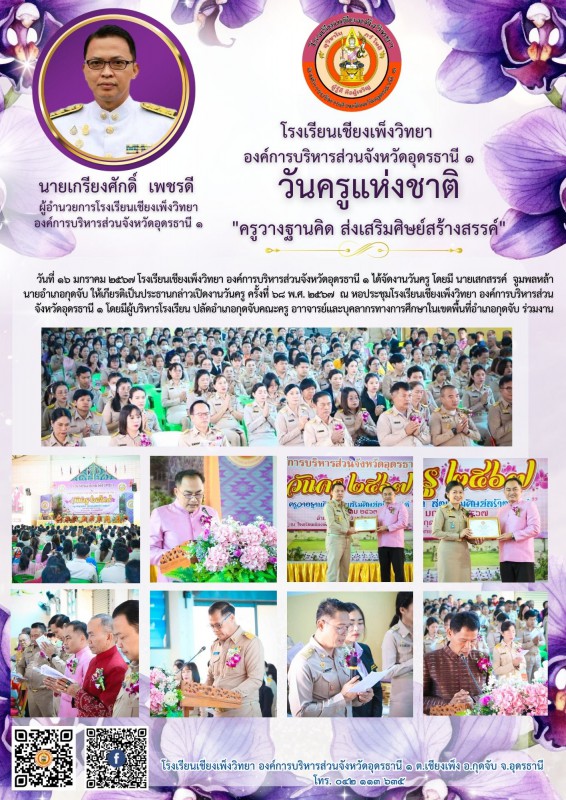 วันที่ 16 มกราคม 2567 เวลา 09.00 น. นายเสกสรรค์ จูมพลหล้า นายอำเภอกุดจับ ให้เกียรติเป็นประธานพิธีงานวันครู ปี 2567 ณ หอประชุมโรงเรียนเชียงเพ็งวิทยา องค์การบริหารส่วนจังหวัดอุดรธานี 1 อำเภอกุดจับ จังหวัดอุดรธานี โดยมีผู้บริหารโรงเรียน ปลัดอำเภอกุดจับคณะครู
