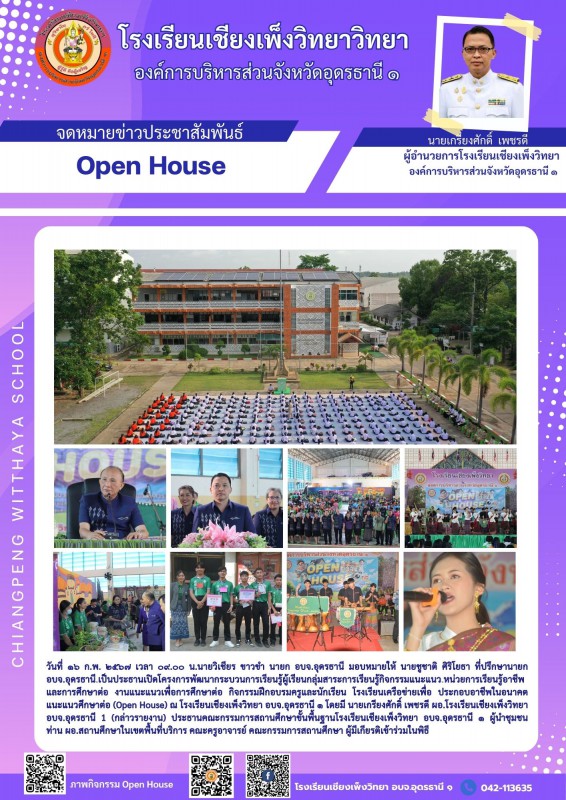 Open House วันที่ 16 ก.พ. 2567 เวลา 09.00 น.นายวิเชียร ขาวขำ นายก อบจ.อุดรธานี มอบหมายให้ นายชูชาติ ศิริโยธา ที่ปรึกษานายก อบจ.อุดรธานี เป็นประธานเปิดโครงการพัฒนากระบวนการเรียนรู้ผู้เรียนกลุ่มสาระการเรียนรู้กิจกรรมแนะแนว หน่วยการเรียนรู้อาชีพ และการศึกษาต